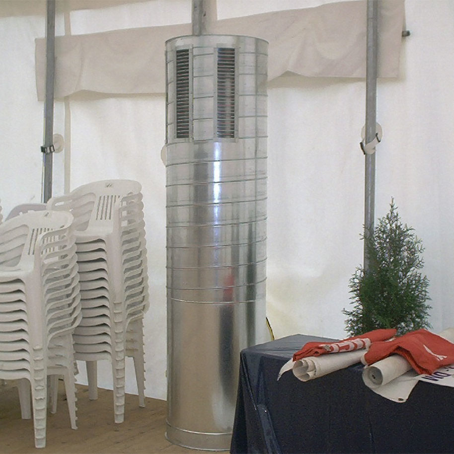 Insbesondere bei VIP-Veranstaltungen und Hochzeiten mit aufwendig eingedeckten Tischen empfehlen wir diese Form der Heizung. Die Luft wird hierbei über verstellbare Gitter von oben in den Raum eingebracht. Durch diese Art der Beheizung lassen sich flatternde Tichdecken oder umherfliegende Servietten vermeiden. Darüber hinaus ist die Einbringung der Warmluft über einen Ausblasturm aus ästhetischer Sicht eine gute Alternative.