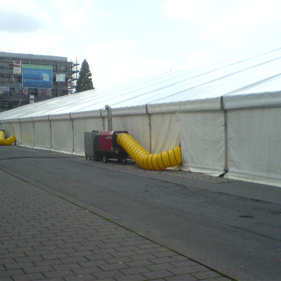 Bei dieser Art der Beheizung wird die Luft mittels eines transparenten Folienschlauchs von der der Zeltdecke aus durch über die Länge des Schlauchs gleichmäßig verteilte Öffnungen in den Raum eingeblasen. Der Schlauch selbst ist dabei entlang eines eigens dafür eingespannten Drahtseils befestigt. Diese Methode eignet sich vor allem zum Beheizen von großen Zelten wie Sie beispielsweise bei Volksfesten und Messen eingesetzt werden. Durch die Transparenz des Schlauches wir dieser optisch als unauffällig wahrgenommen.