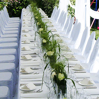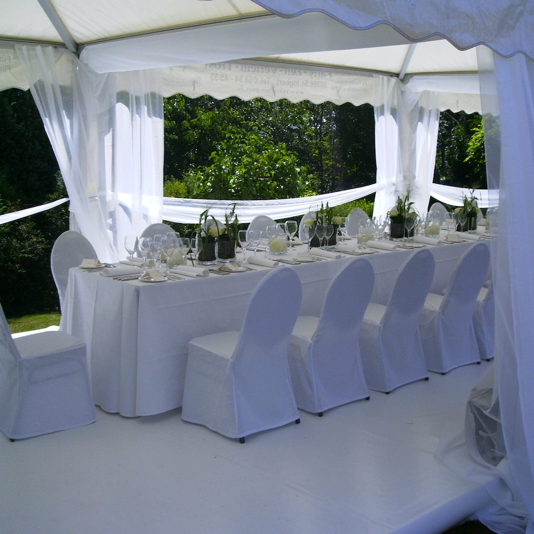Eine sehr wichtige Rolle bei der der Dekoration spielen Tischdecken, Tisch-Hussen, Stuhl-Hussen und Bank-Hussen.
